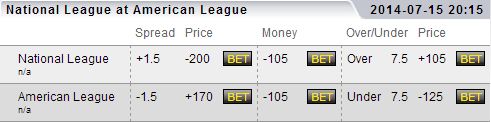 We will place our All-Star Game bet at TopBet.eu on Tuesday as the NL and AL squads collide. The NL squad is the underdog tonight, but this will not deter us from placing 15 percent of our bankroll on them to win the game. We will bet on the OVER 7.5 total runs scored at +105 as the NL rebounds from a loss one year ago.