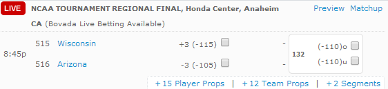 We head over to Bovada.lv to find the betting odds between Arizona and Wisconsin tonight. The Wildcats are favored by just three-points in the West Final. We will lay the line with 10 percent of our bankroll in favor of Arizona as they advance to the Final Four to keep their national title hopes alive.