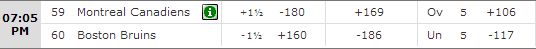 We check the online sportsbook found at SportsBetting.ag for tonight’s odds between the Bruins and the Canadiens from Boston. Here, the Bruins are favored with a line of -1.5 (+160). We will bet 15 percent of our bankroll on Boston as we lay the line for their game five victory and a 3-2 lead in the series.