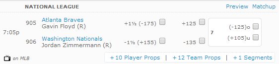 We find the betting odds for tonight’s content between the Braves and the Nationals at Bovada.lv, where the host Nats are favorites to win this game. Washington has been hot, winning two in a row and six of their last 10 games played. We will drop 15 percent of our bankroll on the Nationals and the -135 money line as they take game one from Atlanta.