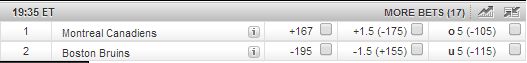 Oddsmakers from Sportsbook.ag have the Bruins as home chalk over the Canadiens in this game one matchup on Thursday night. We are going to take Boston at home over Montreal with 15 percent of our bankroll. Our bet will be for the -195 money line as the Bruins take an early 1-0 lead in the series.