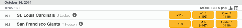 The 2014 National League Championship Series shifts to San Francisco for game three on Tuesday afternoon. Veteran righty Tim Hudson will take the mound for the Giants and he will oppose another veteran hurler, John Lackey, for the Cardinals. This is the first-ever start for Hudson in the NLCS after advancing past the divisional round for the first time in his career. We are going to back the host Giants in this contest as they take a 2-1 lead in the middle of the series.