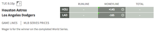Los Angeles is favored to win the series at -165 on the money line. Oddsmakers have Houston pegged at +145 (odds provided by bovada.lv).