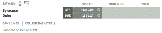 **VGB’s college basketball parlay pick (odds provided by Bovada) — Take Syracuse (+13) over Duke and Kansas (+2) over Texas Tech. If both teams cover the spread, the payoff is $66.13 for a $25 bet. If either team loses against the spread, the ticket is void.
