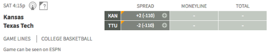 No. 8 Kansas (+2) at No. 6 Texas Tech — The is the game of the year so far for these two Big 12 leaders. Thanks to a three-game winning streak, the Jayhawks (22-6) now lead the conference by one game over the Red Raiders (22-6).