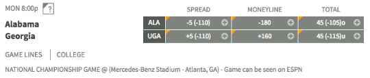 Alabama is favored to win its seventh national title by five points (odds provided by bovada.lv). It’s also the third straight trip to the final game for the Crimson Tide (12-1). The last time Georgia captured the national title was in 1980.