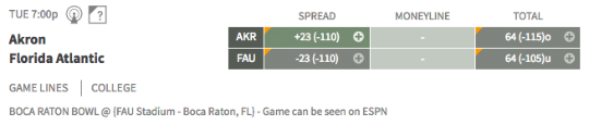Akron vs. Florida Atlantic — This is by far the biggest point spread of the college football bowl season. The Owls (10-3) are more than a three-touchdown favorite to beat the Zips (7-6).