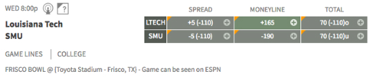 Louisiana Tech vs. SMU — The Frisco Bowl promises to be a high-scoring affair with the over/under line at 70 points. The Mustangs (7-5) average more than 40 points a game, while the Bulldogs (6-6) score close to 29.