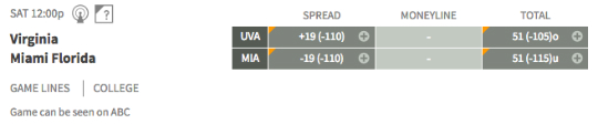The Cavaliers (6-4) have lost three of their last four and are 5-5 against the spread this season. They were a 14-point underdog last weekend, and lost by 17. But the Cavaliers are 5-2 ATS in their last seven games against the Hurricanes and they are bowl eligible for the first time since 2011.