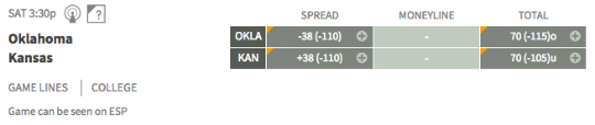 No. 4 Oklahoma at Kansas — There’s little doubt the Sooners (9-1) are going to win this game. They are -39000 on the money line, which means a bettor would have to wager $39,000 to win $100 in profit. Yikes!
