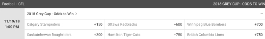 The Saskatchewan Rough Riders (+300) finished second in the West Division behind the Stamps, while the Ottawa Redblacks (+600) won the East Division title.