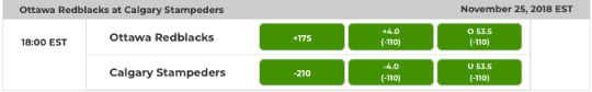 Since Calgary is a four-point favorite, the Stamps must win by five or more points if a bettor selects the West champs against the spread. If a bettor selects the East champs, the Redblack either have to win the game outright or lose by three points or less. If Calgary wins by exactly four points, all bets are a push.