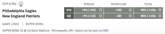 The Eagles (15-3) are trying to win their first Lombardi Trophy in their third attempt. As in their other two playoff games this year, the Eagles are the underdog. The betting line has moved from six points when it was first posted to 4.5 points with the Patriots (15-3) the overwhelming favorites to win their third Super Bowl in four years (odds provided by bovada.lv).