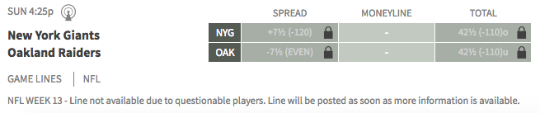 New York Giants at Oakland — Eli Manning is being benched for Geno Smith. Have the Giants (2-9) looked at Smith’s career stats? He throws more interceptions than touchdown passes. He doesn’t even complete 60 per cent of his passes. And now he’s going to lead the Giants on the road over the Raiders? Not likely. The Raiders (5-6) haven’t been playing very well lately either. But they need this one to have any shot at the playoffs.