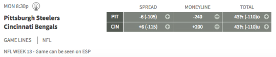 Pittsburgh at Cincinnati — These Steelers (9-2) sure like to keep bettors on their edge of their seats. They are 6-5 against the spread and have thrown in a few clunkers on the road this season — they lost to Chicago and narrowly beat Cleveland and Indianapolis. Now, they meet a longtime rival in the Bengals (5-6), who have won two straight. The last time these two AFC North teams squared off, Pittsburgh won 29-14.