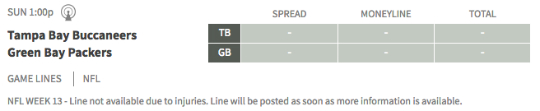 Tampa Bay at Green Bay — The Packers (5-6) will likely have to run the table to make the playoffs and Aaron Rodgers is throwing deep balls in practise. If the Packers can beat the Bucs (4-7), Rodgers may just be a week or two away from playing. The Packers have lost five of their last six without Rodgers, while the Bucs have lost six of their last eight. Tampa is also just 1-5 on the road.