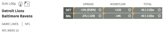 Detroit at Baltimore — Both the Lions (6-5) and the Ravens (6-5) are fighting for a wild card spot in their conferences. Both teams are also 5-5-1 against the spread. The Ravens are 1-2 against the other three teams from the NFC North, while the Lions are 1-1 against teams from the AFC North. Baltimore ranks near the bottom of the league in total defense and dead last in passing yards on offense.