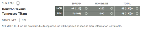 Houston at Tennessee — The Titans (7-4) are tied for the AFC South lead after winning five of their last six games. They host the Jaguars on New Year’s Eve, which could decide the division title. This week, though, they line up against the Texans (4-7), who have lost three of their last four games — all without rookie sensation Deshaun Watson. The Titans are 4-6-1 ATS, while the Texans are 7-4.