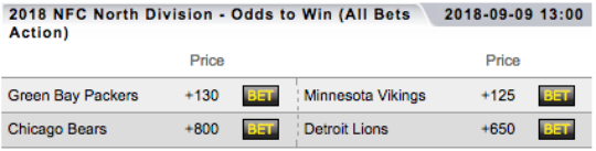 The Vikings, who won the NFL North last season, are the +125 favorites to repeat again this year. Rodgers and the Packers are just a few ticks behind at +130 (odds provided by TopBet).