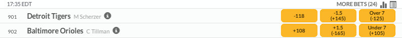 Game one of the ALDS between the Tigers and the Orioles will be played at Oriole Park on Thursday evening. First pitch is slated for 5:37 PM ET between these two American League rivals. Max Scherzer gets the start for the Tigers and will be opposed by Chris Tillman of the Orioles. This is the second straight year that Scherzer opens the post-season for the Tigers. We are going to bet on Detroit as they open the division series with a victory over Baltimore.