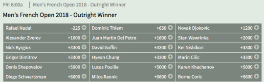 With Federer skipping the French, there are really only two major threats to Nadal’s incredible dominance on Court 1 — Thiem (+650) and Novak Djokovic (+1200).