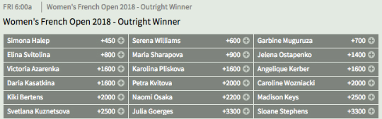 Nadal will defend his title as a -225 favorite on the men’s side in the premier clay court tennis championship — the second of the four annual Grand Slam events. Simona Halep is the +450 choice on the women’s side (odds provided by Bovada).