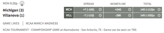 Michigan started the tournament at +1000 to take the title. The Wolverines remain huge underdogs at +245. Villanova was the pick to win it all before March Madness began at +450. The Wildcats are now overwhelming favorites at -290.