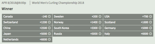 Betting is offered on each individual game in the 18-draw tournament (odds provided by Bovada). In the above example, Canada is favored to beat Russia by 3.5 points. That is called the point spread. Gushue’s team is -2500 to win the game on the money line, while Russia is +1000. And the betting line for the total points scored by both teams in the game is 12.5.