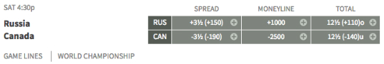 Money line: Canada is the prohibitive pick to win its opening-round game. You would have to bet $2,500 to make a profit of $100 on the money line, which is a bet where you simply just pick the winner of the event. A Russian victory would earn you $1,100 for a $100 bet ($100 bet plus $1,000 profit).