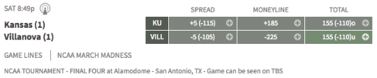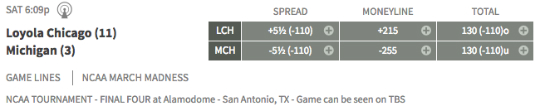 It’s March Madness and the Final Four. The last few teams left standing meet in San Antonio to decide the NCAA men’s college basketball champion. Michigan is a -255 favorite to end Loyola-Chicago’s Cinderella story, while Villanova is the pick on the betting line at -225 to knock off Kansas (odds provided by Bovada).
