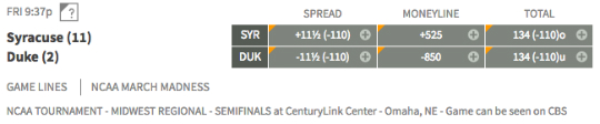 Duke is the biggest favorite in the Sweet Sixteen round, with the line at 11.5 points. They are also now favored to win the championship at +325. Syracuse is 66-1.