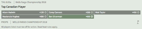 Another alternative bet is which golfer will finish with the lowest score among players from their native countries. Adam Hadwin is the favorite among all Canadians at Wells Fargo. The 30-year-old has finished in the Top 25 in six-of-nine events this year, including three Top 10s.