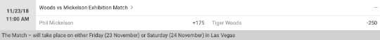 Woods, arguably the greatest golfer of all time, is a prohibitive favorite (-250) to take yet another title and bragging rights from Mickelson (+175) in this pay-per-view event (odds provided by Bovada).