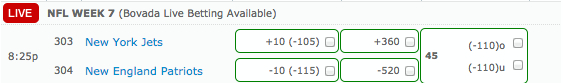 On Thursday night, the Patriots will host the Jets in what should be another ugly Thursday Night Football contest on national television. We are going to make our bet at Bovada.lv, where the Patriots are favored by 10 points. We will drop 20 percent of our bankroll on the host Patriots and the -520 money line as they take down the Jets.