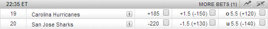 The oddsmakers over at Sportsbook.ag have the host Sharks as -1.5 (+130) favorites on Tuesday night when the Hurricanes come to town. We like the spread, but are more in favor of the money line, which comes in at -220. We will drop 15 percent of our bankroll on San Jose and the -220 money line.