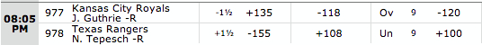 Kansas City is one of the hottest teams in baseball right now, overtaking the lead in the AL Central and building a 2.5 game cushion over the Tigers. They grabbed the win in game one of this series and will ask veteran Jeremy Guthrie to continue his personal hot streak tonight. Texas is the worst team in the Majors by one game and will look to play the role of spoiler for the rest of the season. We are going to put our money on the Royals as they stay hot.