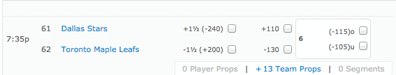 When the Stars visit the Maple Leafs for an NHL contest on Tuesday night, we will find the odds at Bovada.lv, where Toronto is favored to win this game. We are going to drop 15 percent of our bankroll on Toronto and the -130 money line as they take home another victory.