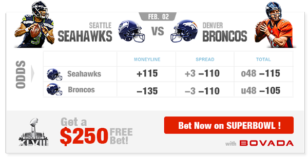 The place to bet on Sunday for the Super Bowl is none other than Bovada and their online sportsbook. If you choose to bet on the game’s outcome, the Broncos are favored at -3 (-110) to take the league title. Should you bet on a prop, go with touchdown as the first score of the game at -145.