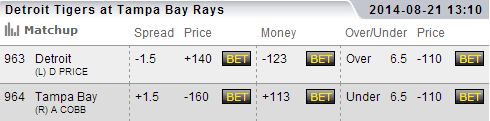 Tampa Bay and Detroit lock horns on Thursday afternoon in David Price’s return to Florida. We will place our wager at TopBet.eu, where we will lay the line of -1.5 (+140) with 10 percent of our bankroll in favor of Price and the Tigers as they sweep this series and stay with the Royals in the Central.