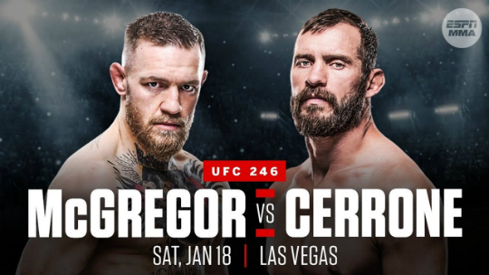 Notorious (-235) is the overwhelming favorite in the welterweight main event to be held on Saturday, January 18 at T-Mobile Arena on the famous Las Vegas Strip (UFC 246 betting lines provided by Bovada). The former two-division champion’s opponent — Donald Cerrone (+185) — has lost his last two fights by knockout.
