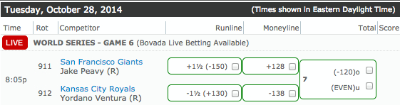 As the Giants prepare to visit the Royals in game six of the World Series on Tuesday night, we will prepare our wager with the odds found at Bovada.lv. We are going to put 10 percent of our bankroll on the Giants and the OVER 7 total runs scored at -120 as they win the series 4-2 over the Royals.